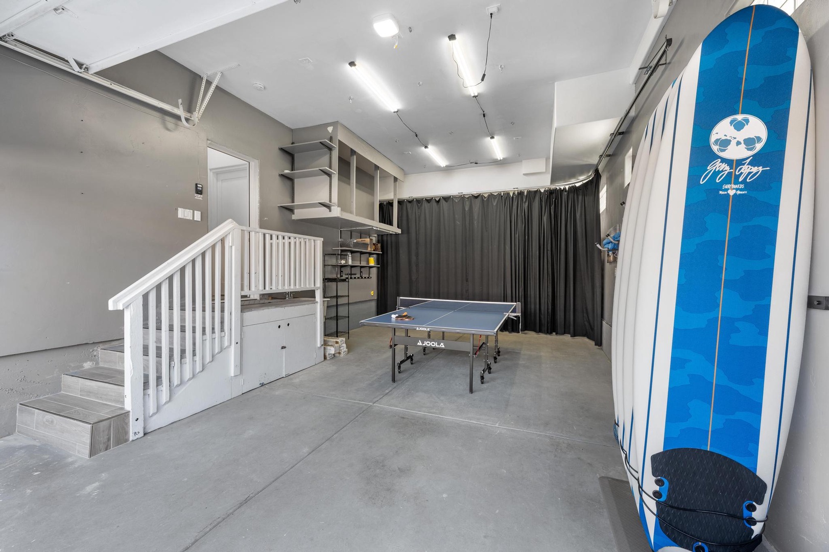 Additional amenities include Beach chairs and foam surf boards, a ping pong table, air-conditioning, Wi-Fi, ceiling fans, a work desk, ready-made beds, one full towel set and beach towel per guest, and a starter kit of household and bath soaps and paper goods. In-home laundry and detergent are also provided for your convenience.