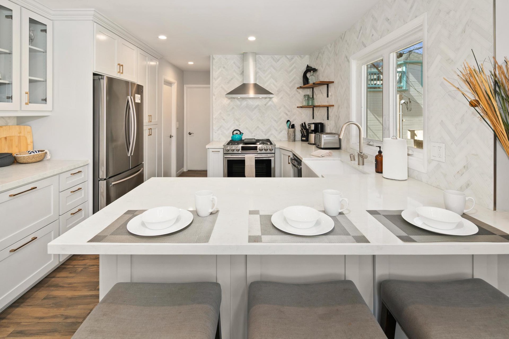 The main living level features dining table for six adjacent to the living area with a sectional sofa and flatscreen TV. The vaulted ceiling with skylights brings an open feel to the space and lets the sunshine in! The open kitchen features clean, white quartzite counters with herringbone tile back splash and stainless-steel appliances, including a convenient wine-fridge.